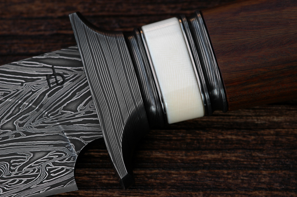 Čepel: uhlíkový damašek je vykován ze čtyř torzních prutů nad sebou z ocelí: WNr. 1.2842, 1.2767